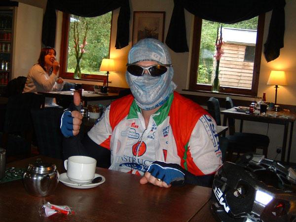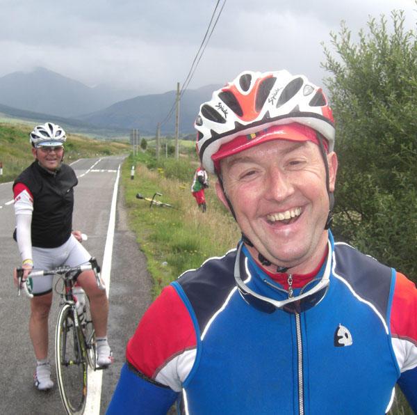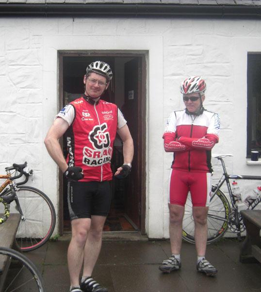 We escaped the outskirts of Glasgow dead on 9:15, and were quickly skirting Loch Lomond. The forecast was showers, some of them heavy, but they seemed very nearly joined up to me, especially so as we headed upwards into mountain country. It's hard to believe this is July as leg warmers, arm warmers, head warmers, and any other kind of warmer was whipped out to try and ward off the chill. Stopping in Tarbet for elevenses (first time we've had those!) we quickly found ourselves engulfed by stationary queues of traffic on the not so bonny banks of Loch Lomond (sorry, I *had* to write that).